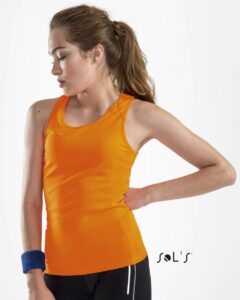 Canotta donna Dorso nuoto, Girocollo e giromanica in costina, Punto vita sfiancato, Tagliata e cucita. 100% Poliestere effetto traspirante – 140 g/m2. Vestibilità: Regular
