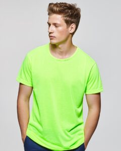 T-shirt manica corta in colori fluor, girocollo e rinforzo in costina all´interno in colori fluo. Tessuto in poliestere tatto cotone. 100% poliestere, tatto cotone – 155 g/m2. Vestibilità: Regular